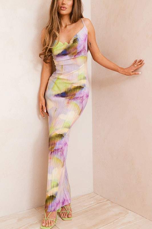 Multicolored Print Mesh Sleeveless Spaghetti Straps V-Neck Cowl Electric Pleats Slim-Fitting Ruffle Hem Maxi Dress...