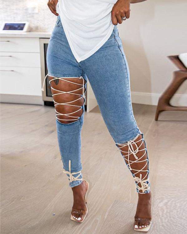 Explore comfort and style with our women's lace-up ripped jeans. Crafted from lightweight, stretchable denim...