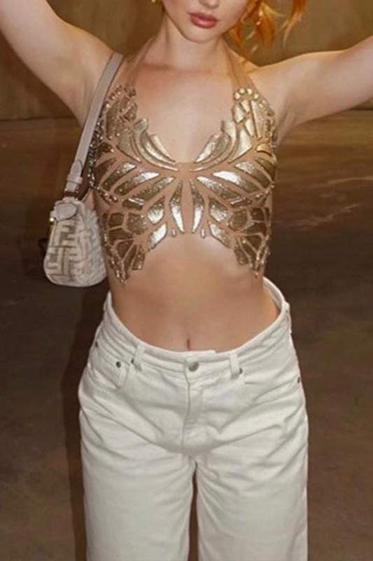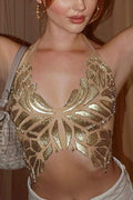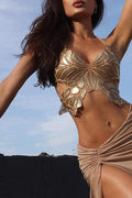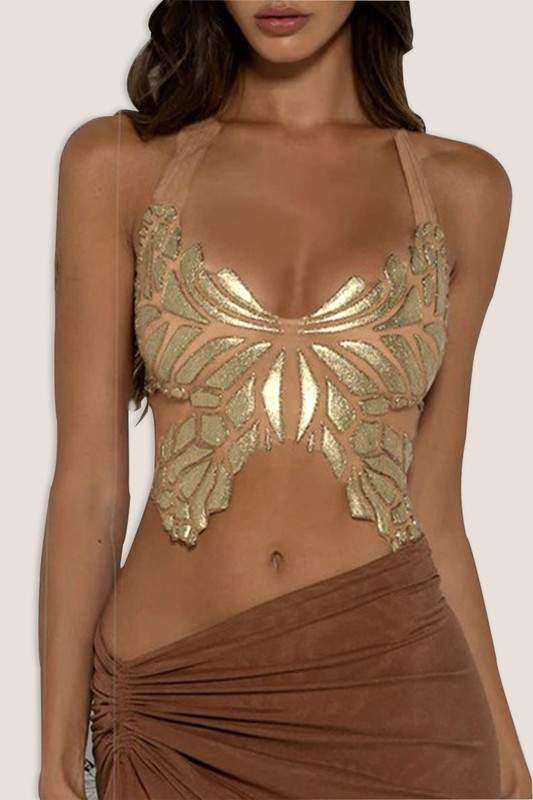 Stylish Design: unique butterfly pattern with gold embellishments, Chic Style: perfect for parties and festivals, Comfortable Fit: designed for an elegant silhouette, High-Quality Material: crafted for durability and comfort, Versatile Wear: easily pairs with skirts or pants for any occasion