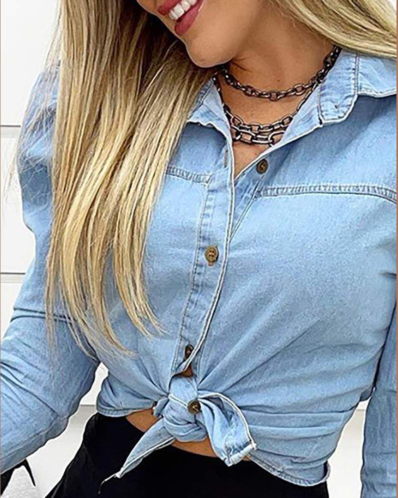 BUTTON FRONT PUFF SLEEVE CASUAL DENIM SHIRT