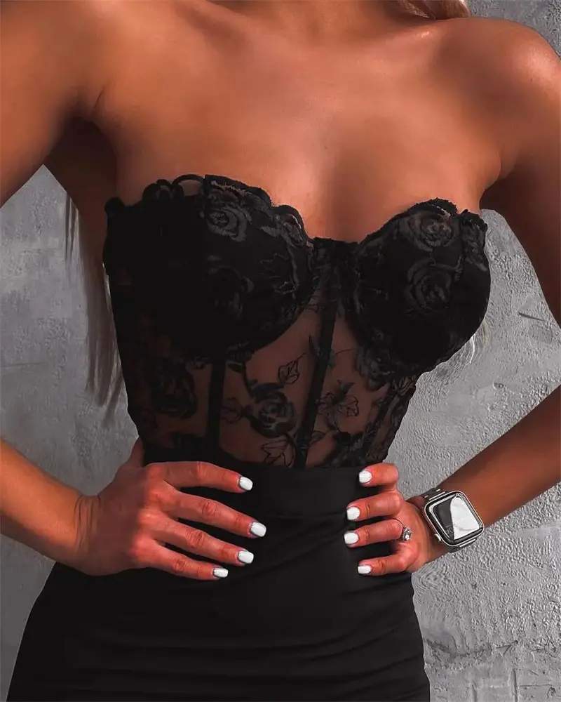 Discover this elegant floral lace strapless bodysuit designed for a flattering fit. This chic evening top features delicate lace detailing, perfect for parties and special occasions. Crafted from high-quality materials, it enhances your silhouette. Available in various sizes, ensuring a comfortable fit for everyone.Party wear: ideal for special occasions and events