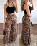Elevate your summer style with this trendy leopard print outfit. The ensemble features a stylish black crop top paired with lightweight wide leg pants, perfect for any casual occasion. Made from breathable fabric, this outfit offers comfort without compromising on style. Suitable for various sizes and designed for a flattering fit.Versatile fit: suitable for different occasions, Easy to style: pairs well with accessories, Comfortable fabric: breathable for summer, Trendy design: animal print and chic look, Flattering cut: wide leg style enhances silhouette