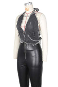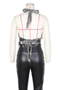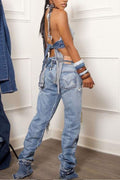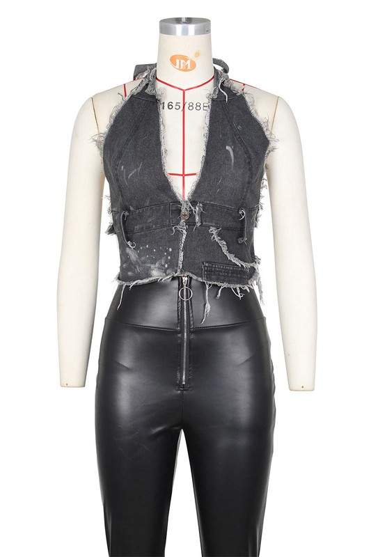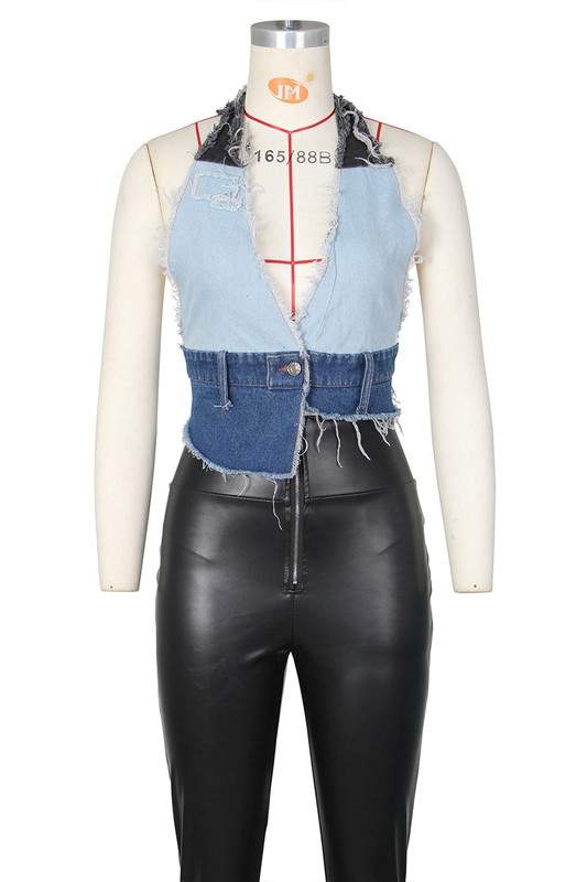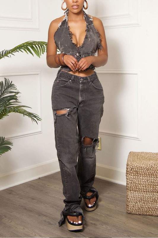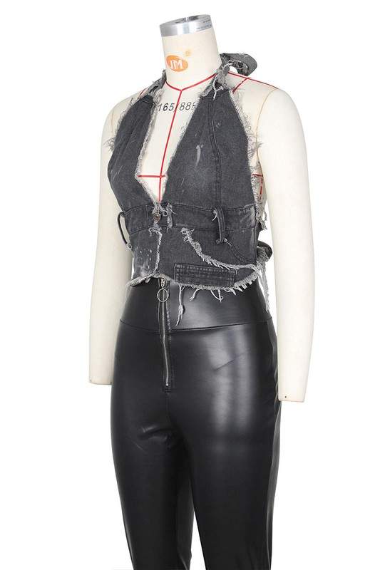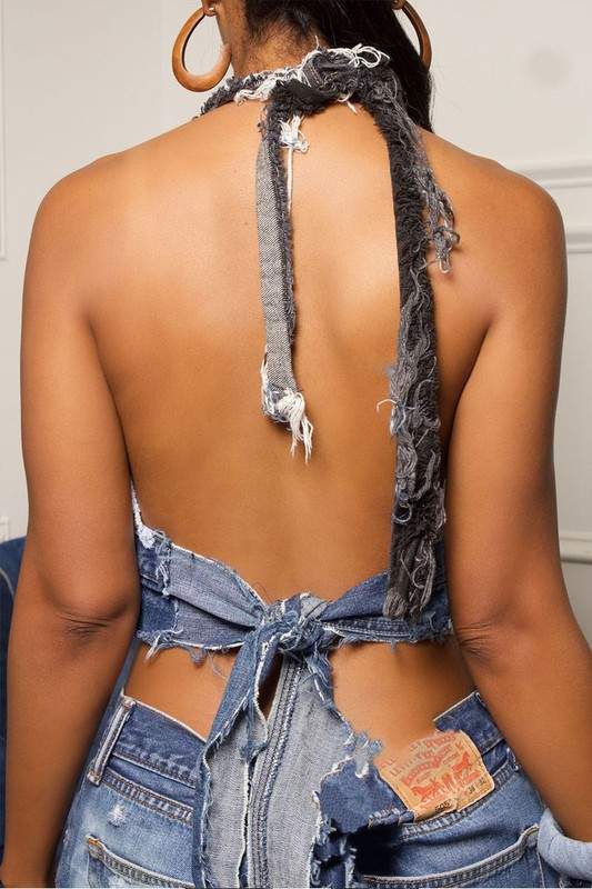• Distressed denim crop top, halter tank top, raw hem ripped denim top