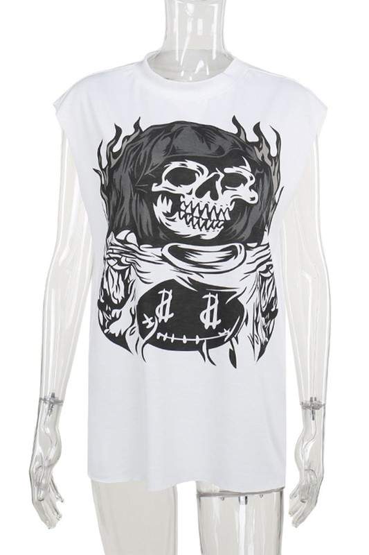 Discover the ultimate edgy style with our skull graphic crop top. Crafted from soft cotton, this sleeveless tee features a striking skull print, perfect for making a statement. Ideal for summer layering or casual outings, designed for comfort and style, available sizes range from S to L for a perfect fit.Comfortable fit: made from soft, breathable fabric