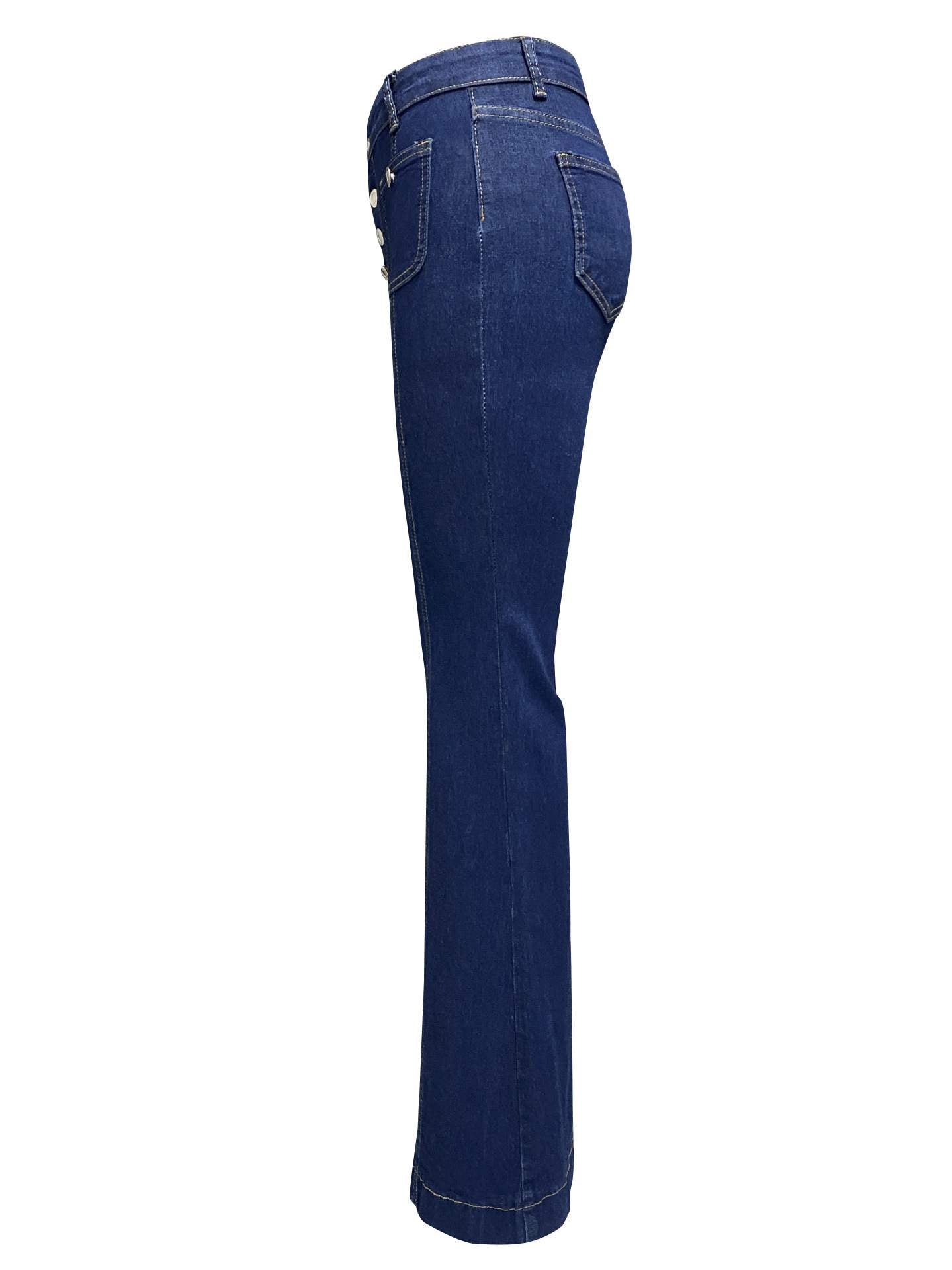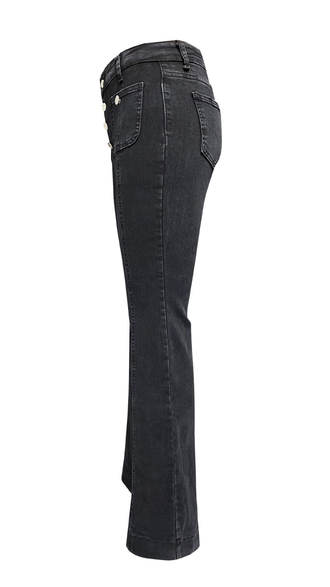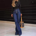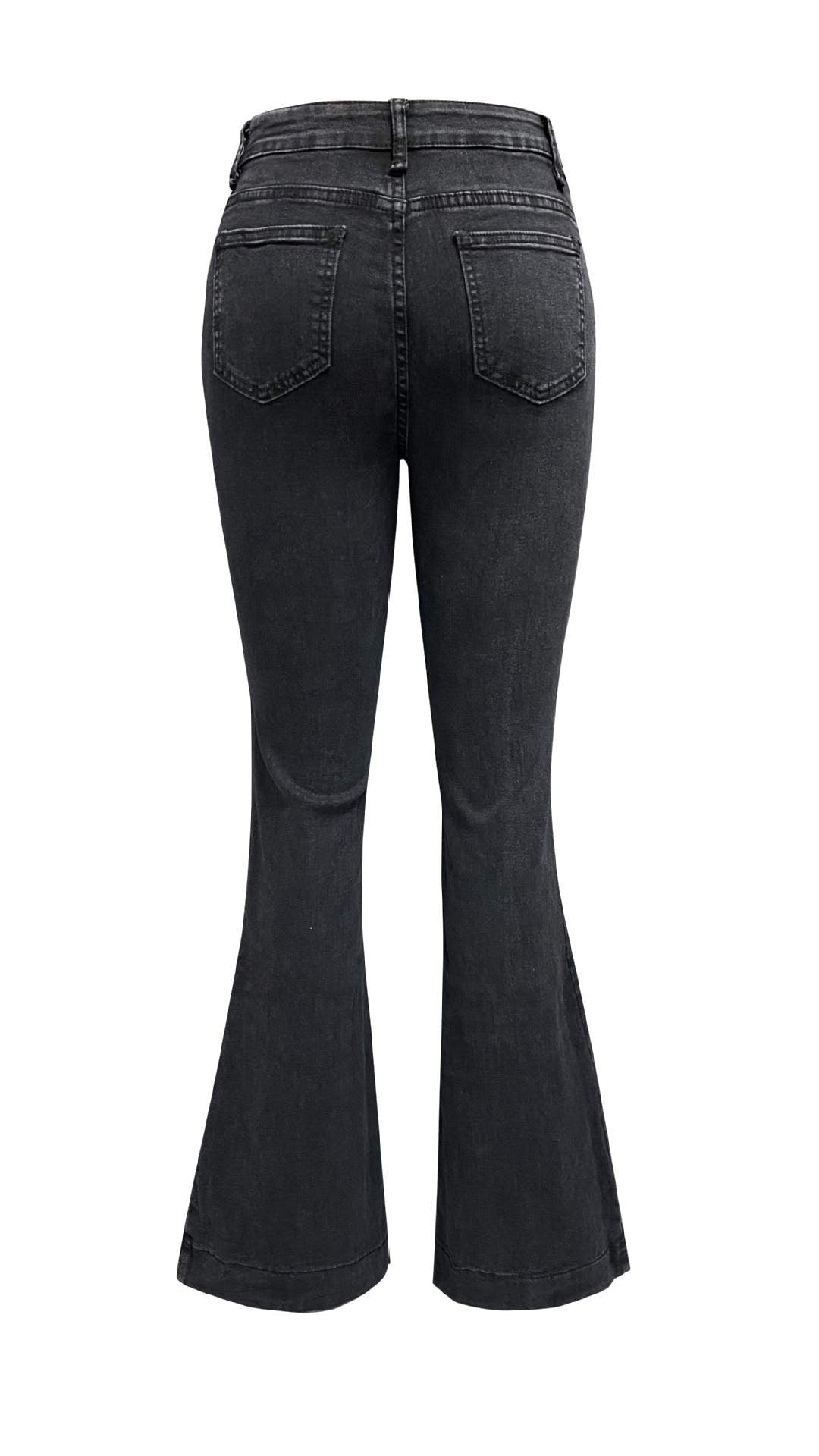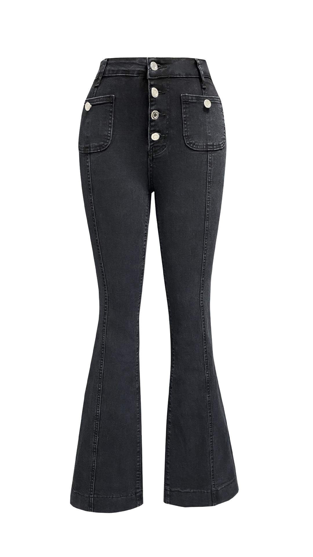 Explore this stylish outfit featuring a modern crop top and high-waisted flared jeans. Made from quality denim for a comfortable fit, the jeans have unique button detailing and a flattering silhouette. Perfect for various occasions, available in multiple sizes.Trendy Design: Flared pants for a modern look