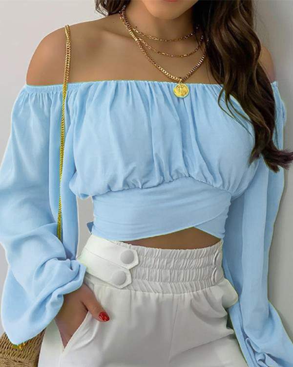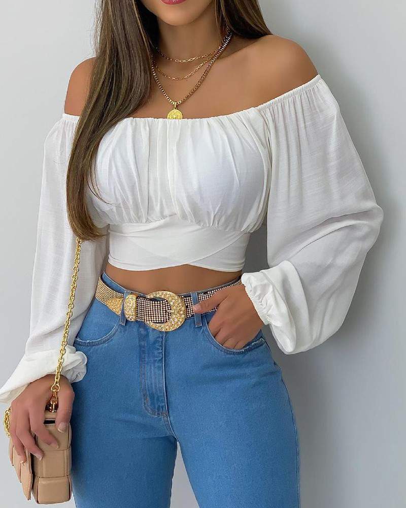 Off Shoulder Ruched Lantern Sleeve Crop Top