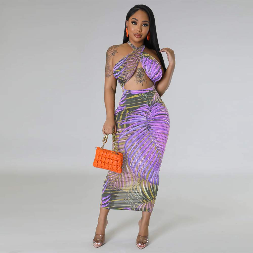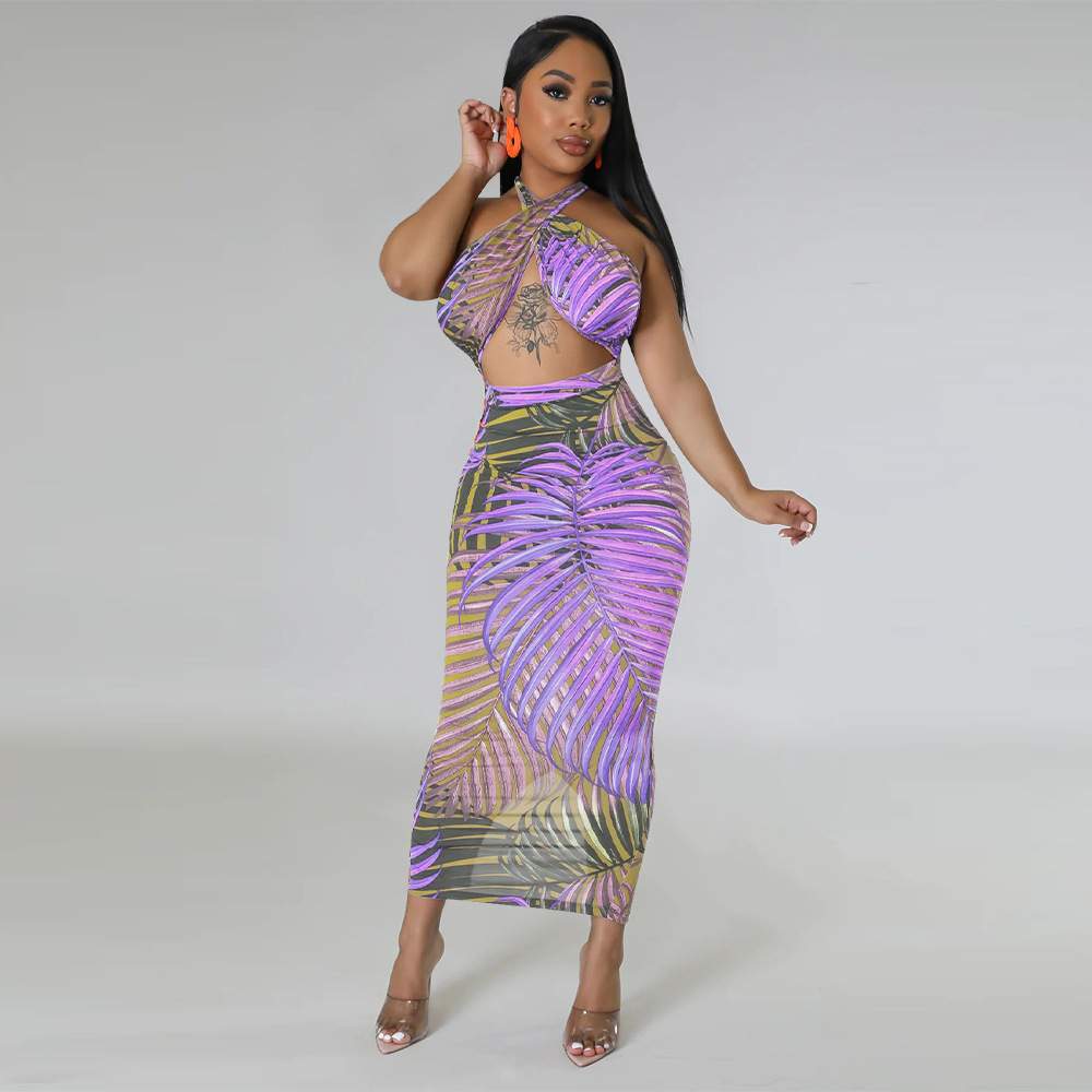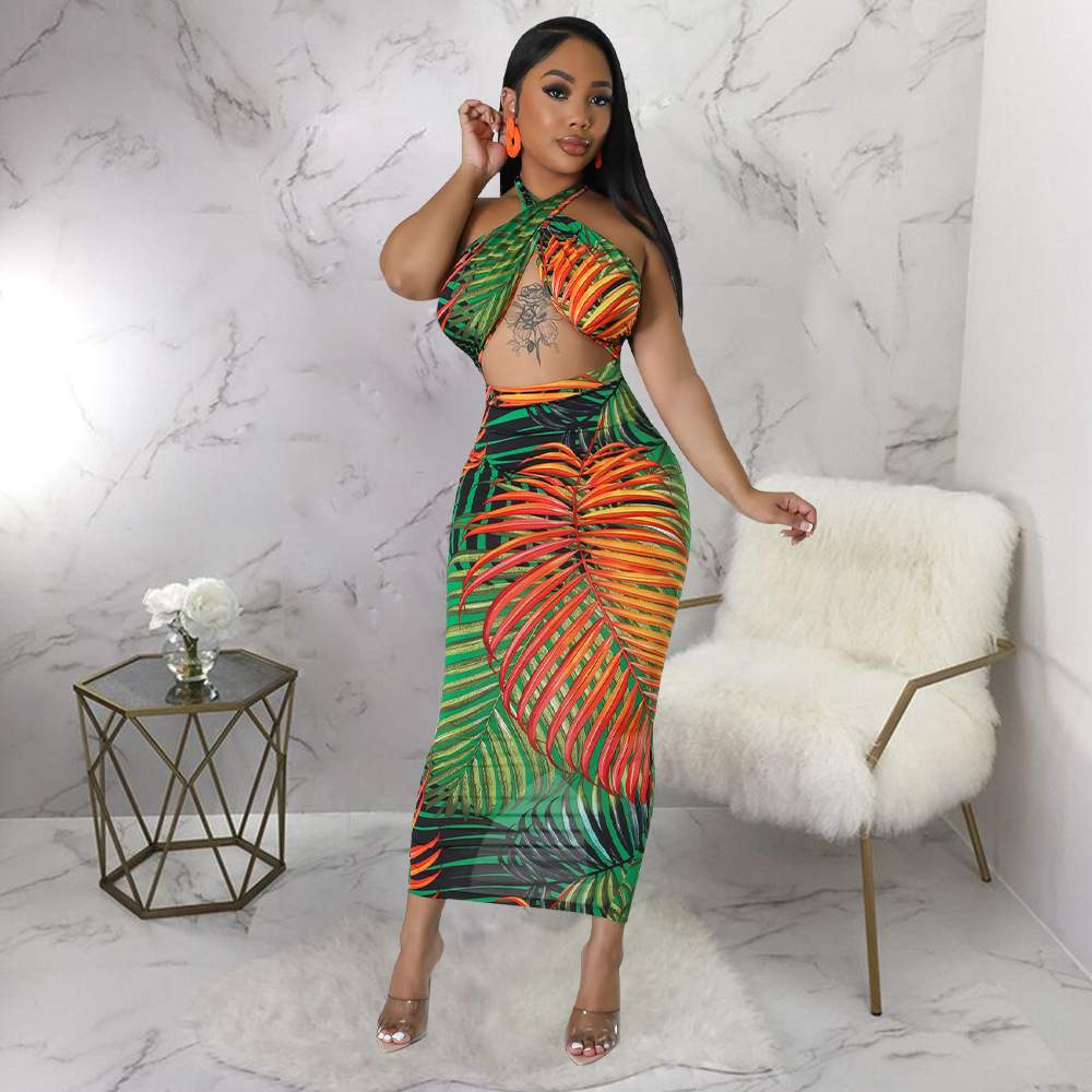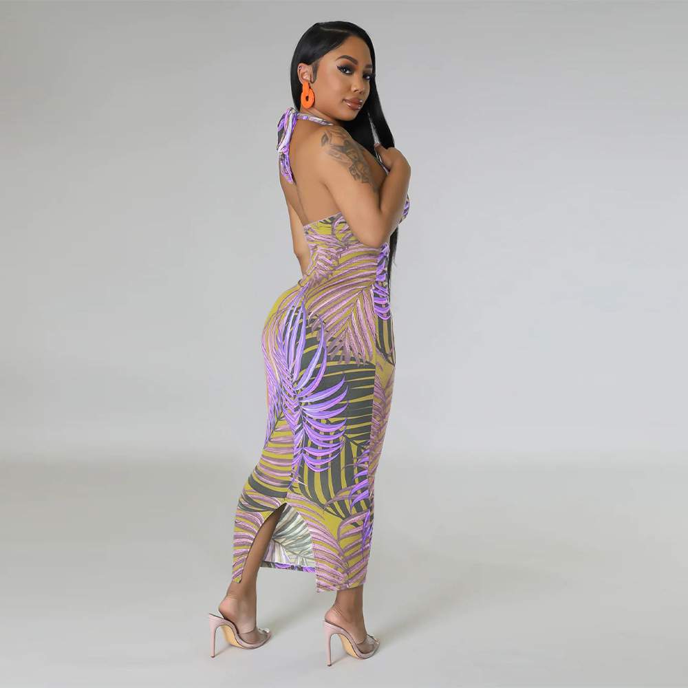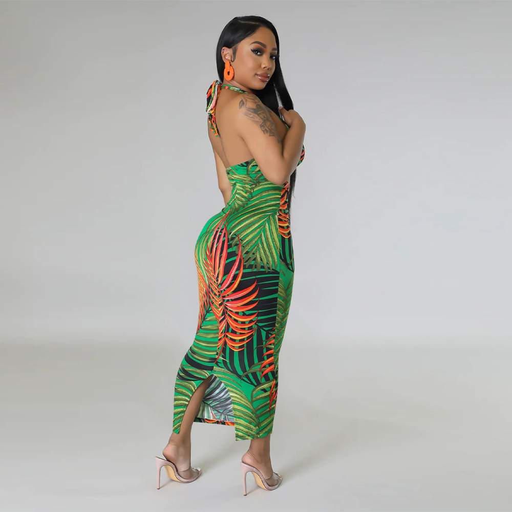 This women's tropical print maxi dress features a halter neck design, high slit for added flair, and bodycon fit that flatters every shape. Perfect for summer parties, vacations, or casual outings. Made from lightweight, breathable fabric, available in multiple sizes, pairs well with stylish accessories.Flattering: Bodycon fit accentuates curves