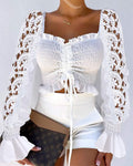 Plain Contrast Lace Flared Sleeves Frill Hem Drawstring Shirred Crop Top