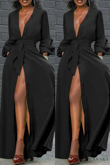 This elegant maxi dress features a wrap design with a flattering side slit, crafted from lightweight material perfect for warm weather. Its long sleeves offer coverage while maintaining a chic look. Ideal for summer outings or formal events, it combines comfort with style, available in multiple sizes.Eye-Catching Slit: Elegant side slit adds flair and femininity