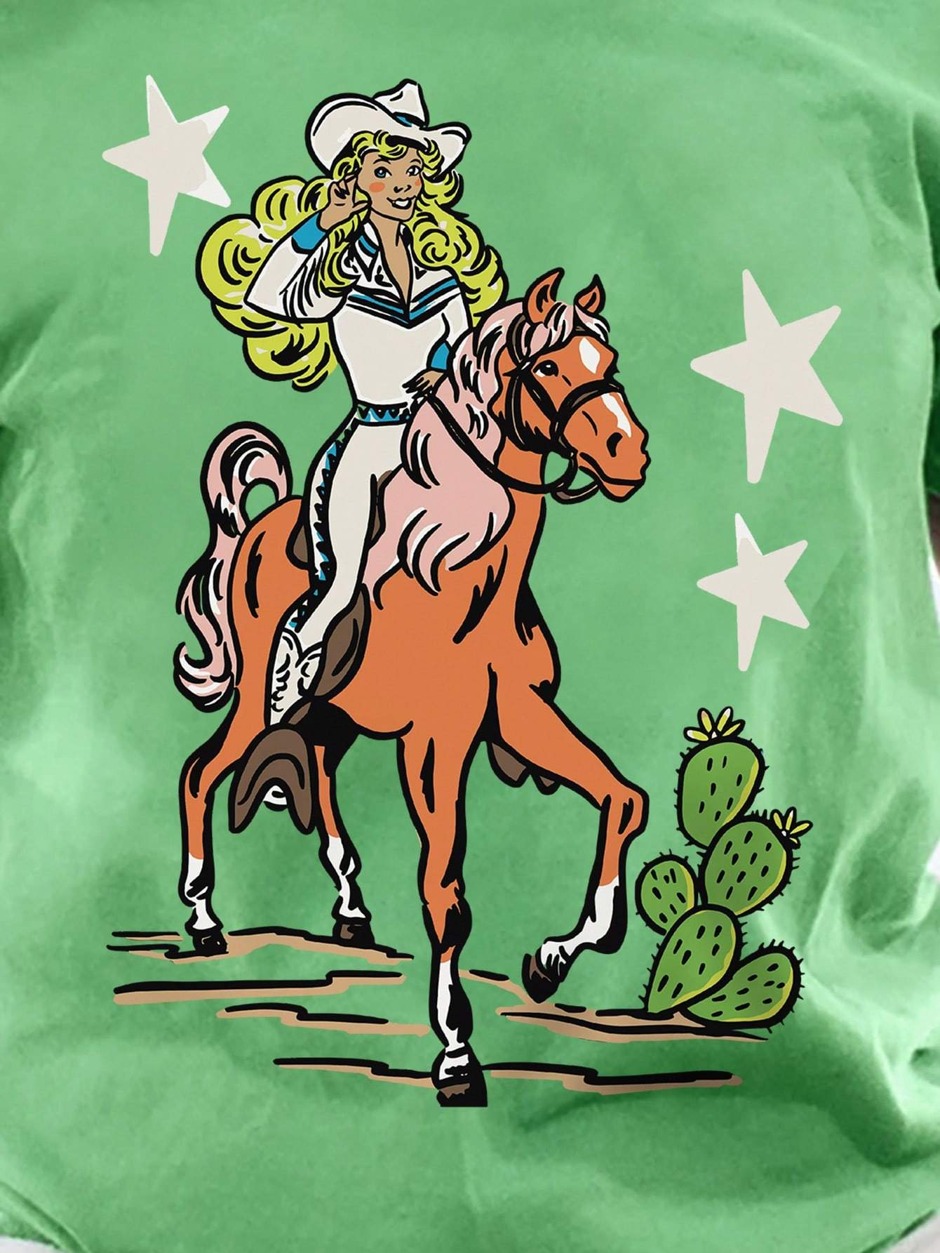 WOMEN S FIVE POINTED STAR HORSE PRINT ROUND NECK T SHIRT